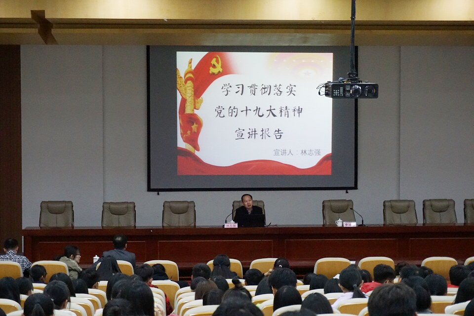 为进一步深入推进学院学习贯彻十九大精神工作,实现师生学习全覆盖,11月27日晚,必赢线路检测中心党总支书记林志强在学术会馆第二报告厅为全体学生干部和学生党员宣讲十九大精神。学院党总支副书记费廷坤主持宣讲会。