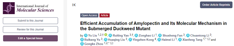 近日,青岛农业大学周功克教授课题组在沉水浮萍新品种(sub-1)支链淀粉理化特性及其高效积累分子机制方面取得新进展。相关研究成果“Efficient Accumulation of Amylopectin and Its Molecular Mechanism in the Submerged Duckweed Mutant”发表于国际期刊International Journal of Molecular Sciences(中科院2区,IF:6.208)上。