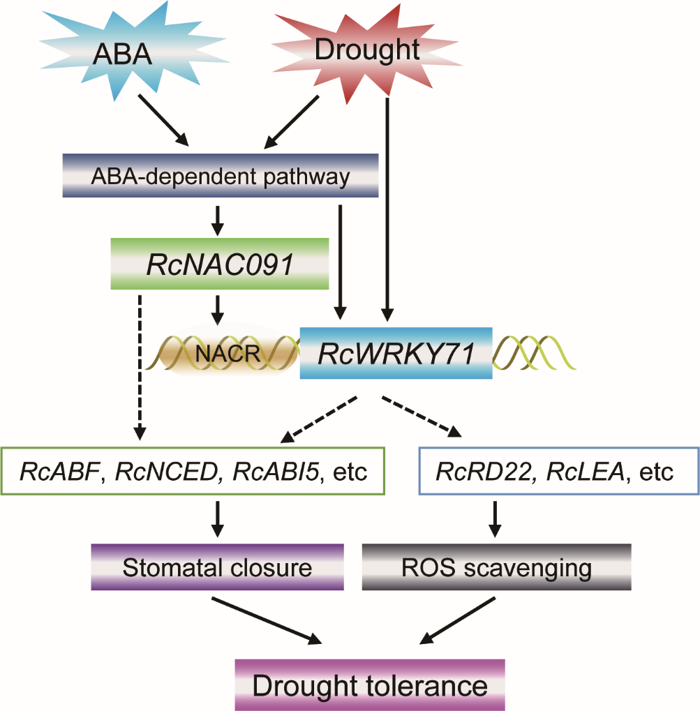 进一步研究结果表明RcNAC091在体内和体外直接靶向RcWRKY71的启动子。RcWRKY71沉默的月季植株对ABA和干旱胁迫都不敏感,而RcWRKY71过表达的植株对ABA敏感,从而产生耐旱表型;同时,ABA生物合成和信号传导相关基因在RcWRKY71沉默株系中的表达均受到影响。上述研究结果揭示了月季适应干旱胁迫过程中的RcNAC091-RcWRKY71分子调控模块,RcWRKY71能够被RcNAC091转录激活,影响其对ABA途径相关基因的表达而参与干旱胁迫过程。