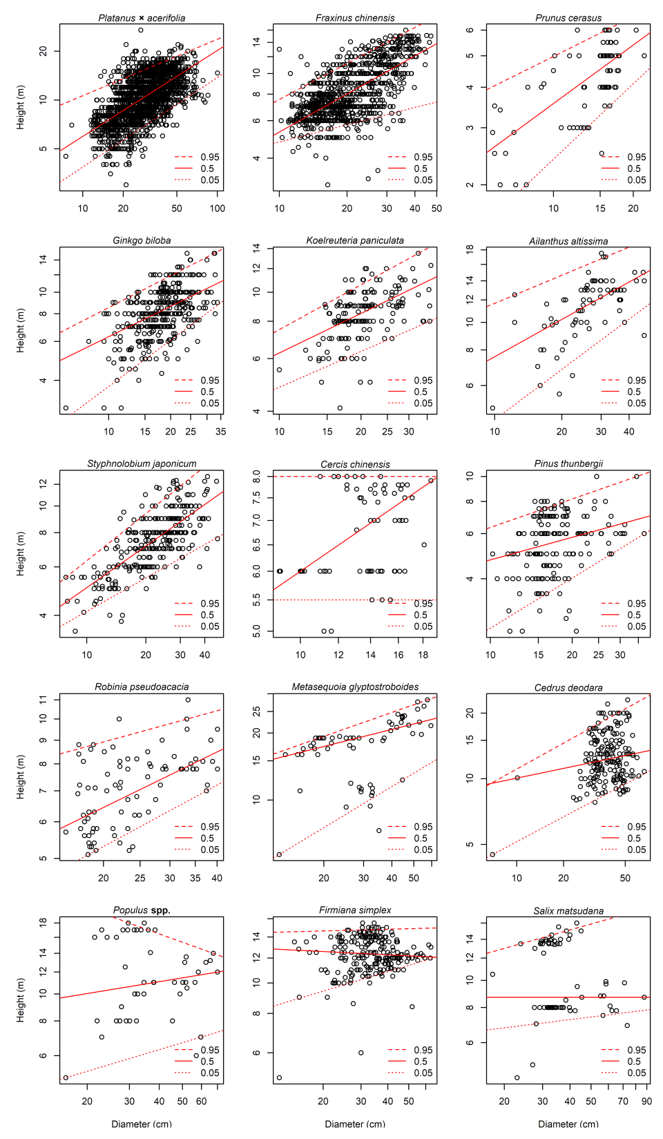 图2 青岛市15树种树高-胸径异速关系的分位数回归(95%、50%和5%)拟合图